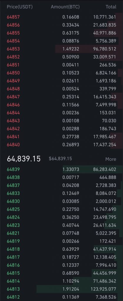 In the image above you can see the sell orders in red and the buy orders in green. When there is more buying pressure than sell orders the price tends to go up. The inverse is also true.